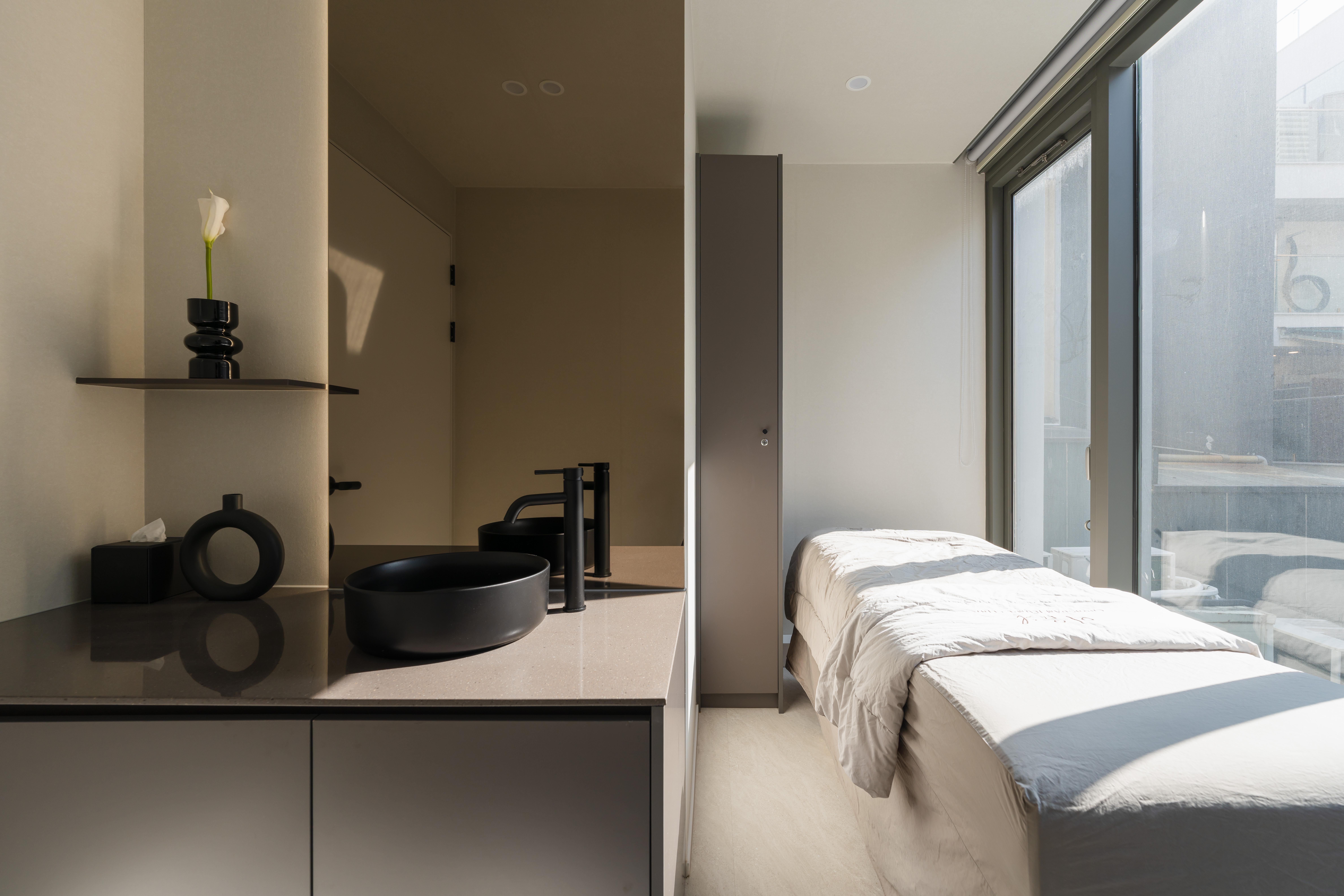 로비는 공간의 효율성을 고려해 설계했어요. 직선적인 디자인의 컴팩트한 접수 데스크와 빌트인 모니터, 선반을 배치해 기능성과 인테리어 효과를 동시에 만족시켰어요. 치료실은 1인 베드와 세면실을 별도로 구성해 쾌적함을 더했고, 베이지 베딩과 그레이 가구를 조합해 차분한 분위기를 완성했어요.