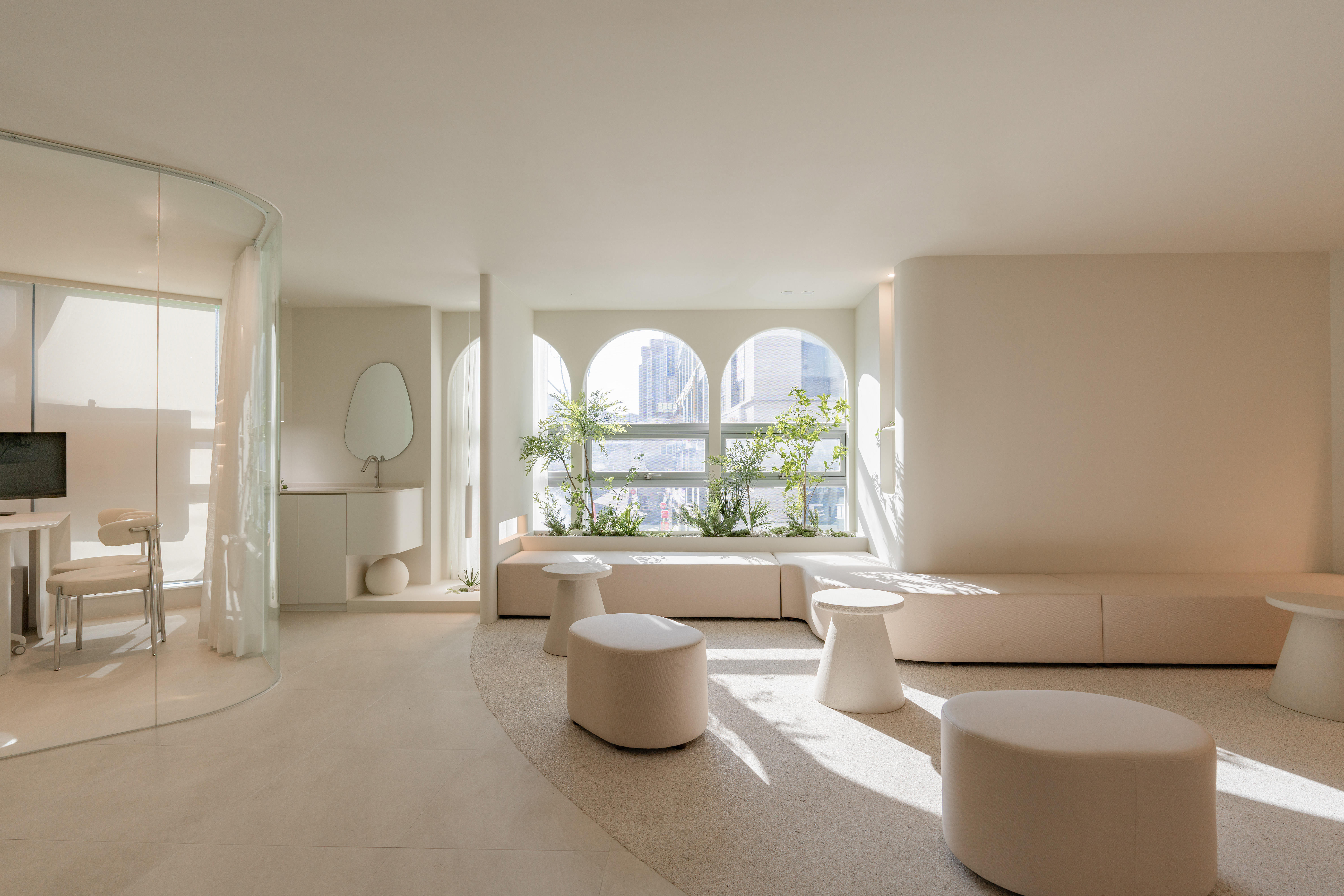 전체적으로 화이트와 뉴트럴 톤을 바탕으로 한 컬러 팔레트는 공간에 여백과 편안함을 부여하며, 군더더기 없는 가구 배치는 정제된 감각을 드러냅니다. 공간 중앙에는 부드러운 곡선으로 설계된 좌석과 테이블이 배치되어 있으며, 벽면에는 간접조명을 활용한 라운드 조형이 포인트 역할을 합니다. 창가에 자연 식재를 배치하여 실내에서도 자연과의 연결감을 느낄 수 있도록 했으며, 이는 휴식과 회복을 위한 공간이라는 목적성을 강화해줍니다.