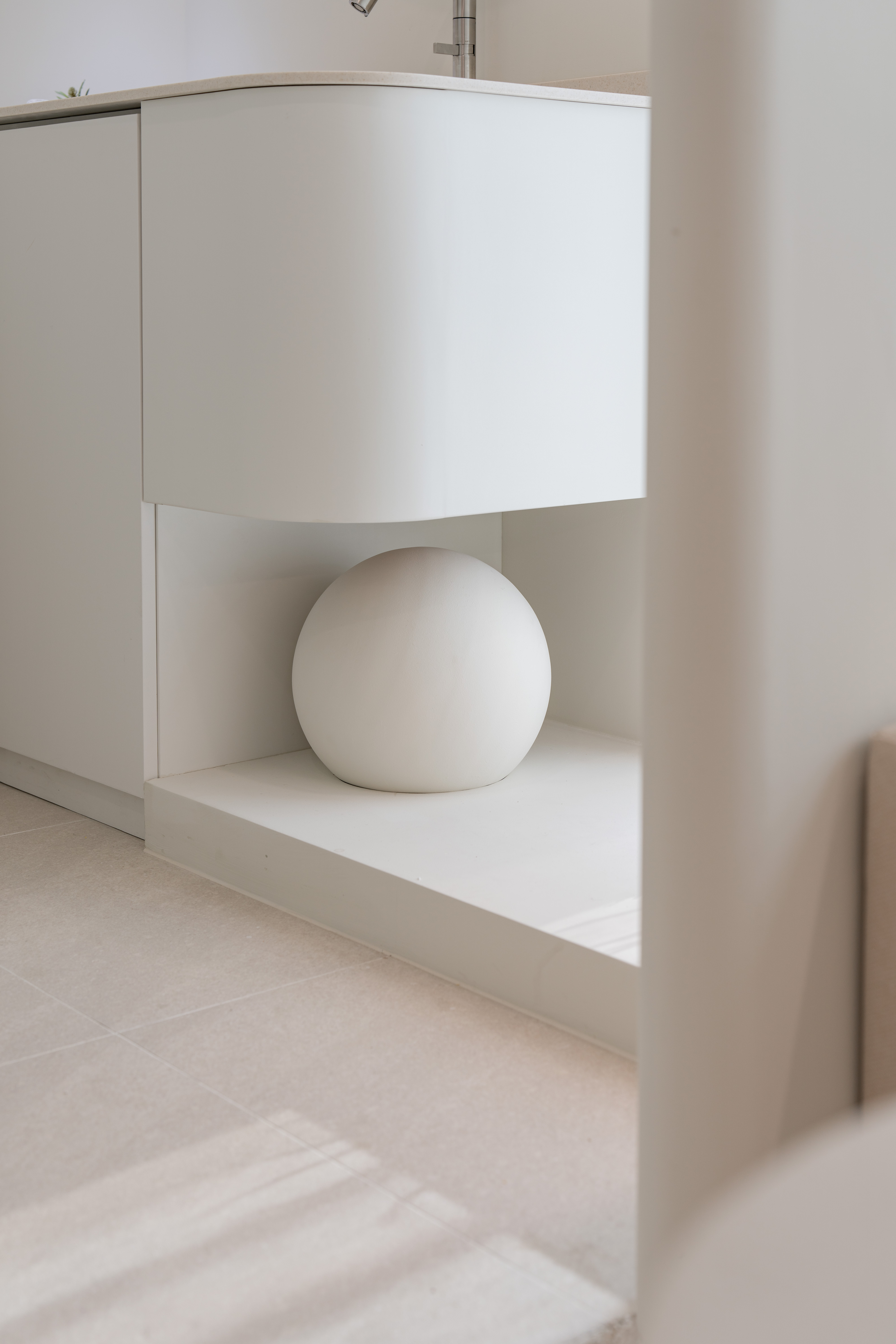 자연광이 풍부하게 들어오는 아치형 창과 부드러운 곡선의 레이아웃이 조화를 이루는 미니멀한 공간입니다.